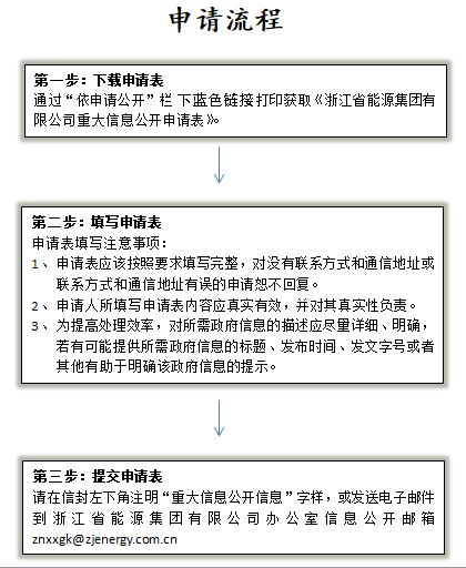 申請人通過現場和信函、傳真提出申請的,應填寫書面《浙江省能源集團有限公司信息公開申請表》(以下簡稱《申請表》),書面《申請表》可在受理地點領取或自行復制或從浙江省能源集團有限公司門戶網站中下載打印。